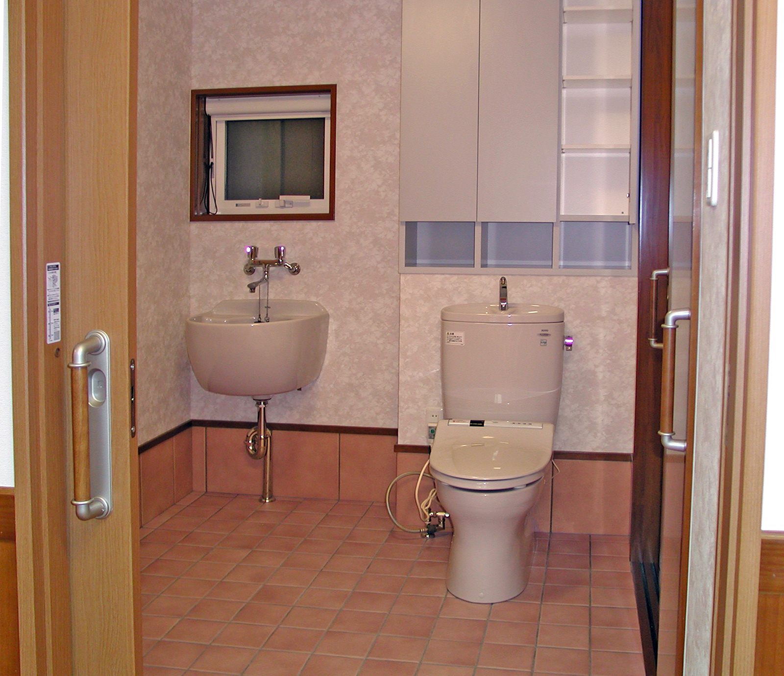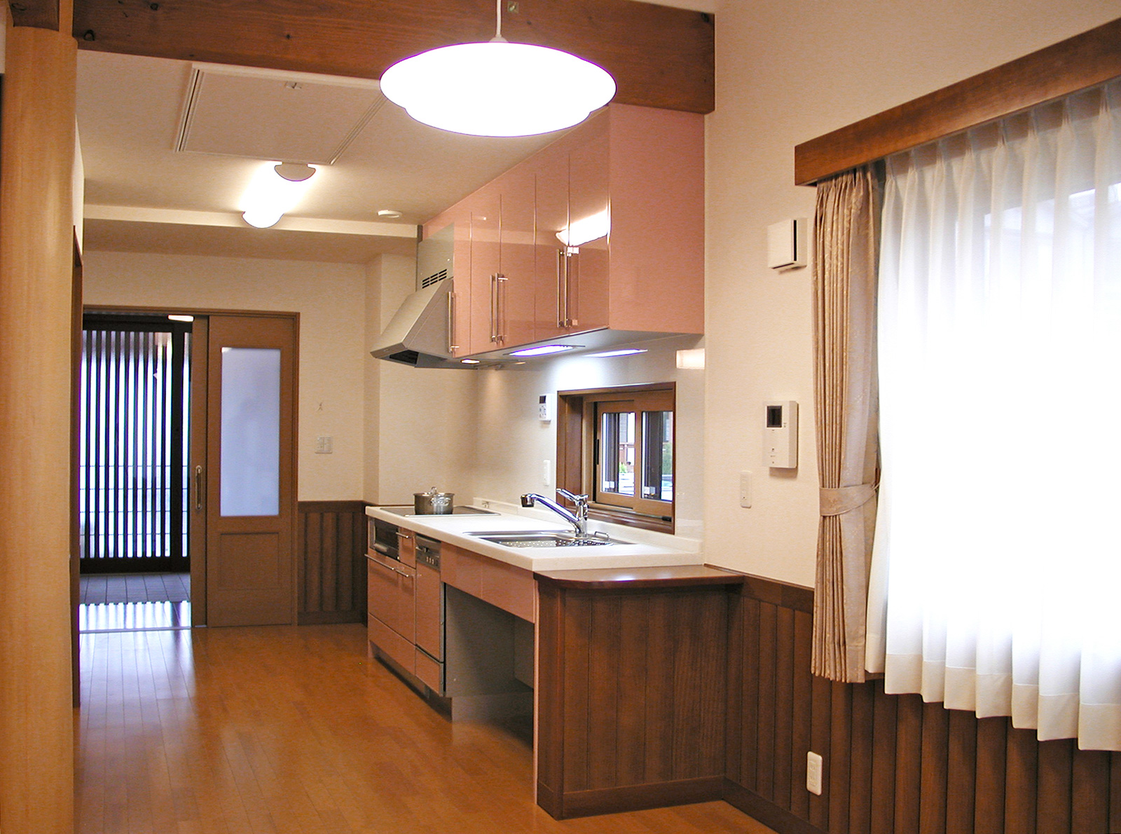 南鳥羽の家 用途:専用住宅 場所:京都府京都市 構造:木造平屋建 延床面積:65.37㎡ 介護が必要になった奥様をご主人が介護するために計画されました。 バリアフリーはもちろんのこと、介護の負担軽減のためのリフト動線に合わせて、ベッドと水廻りを一直線にレイアウトしたり、お料理好きの奥様のために車いす対応のキッチンを採用して身体機能の改善を目指しています。